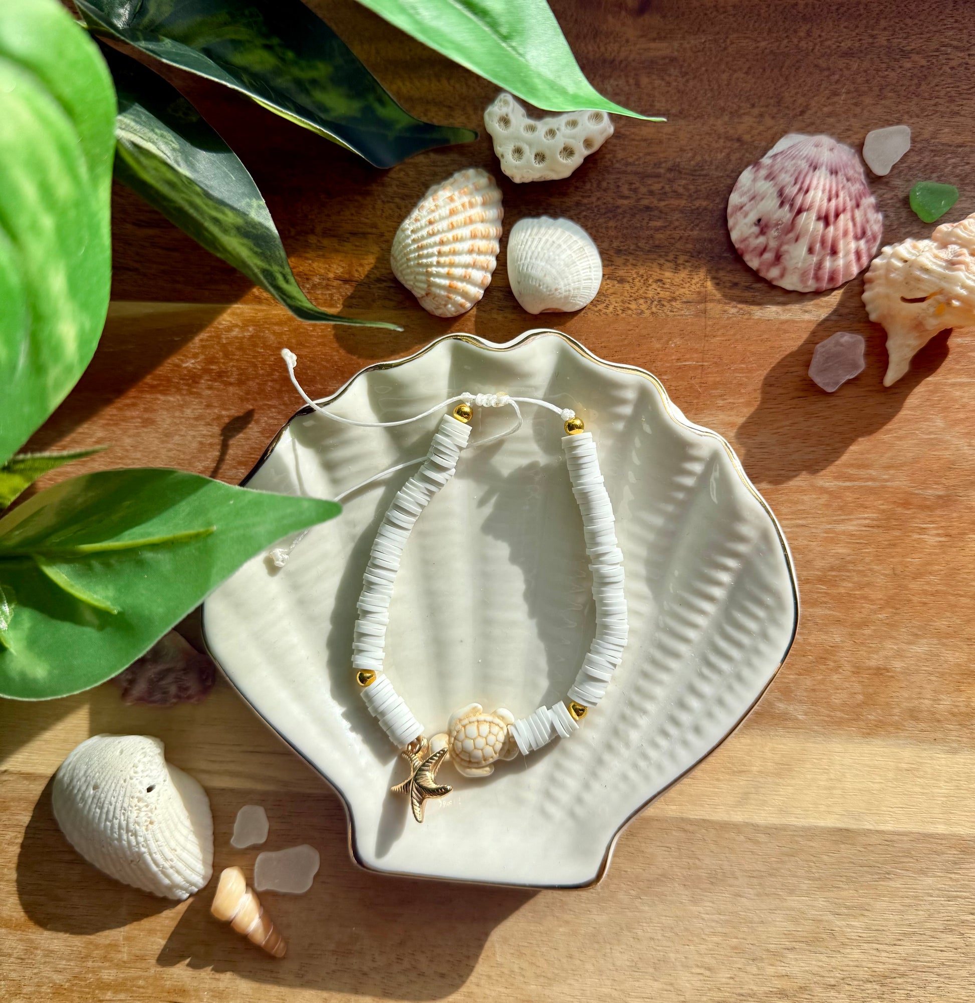 Early Morning Seafoam has that calm, peaceful vibe you get from the ocean right after sunrise. It’s made with white waterproof wax string and soft white clay beads that give it a clean, fresh look. In the center is a white turtle charm paired with a small gold starfish charm, creating a simple but really beachy feel.